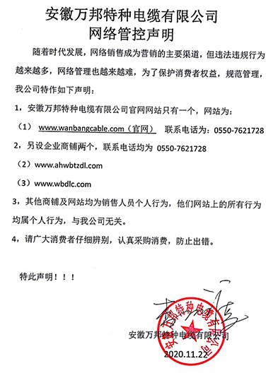 鄭重聲明:安徽萬邦特種電纜有限公司官方網站為:www_wanbangcable_com.ndvr.com.cn,除此之外無任何子網站或合作網站,其余均為假冒偽劣。電話:0550-7621728 13485756353 地 址:安徽省天長市滁州高新技術產業開發區經四路29號